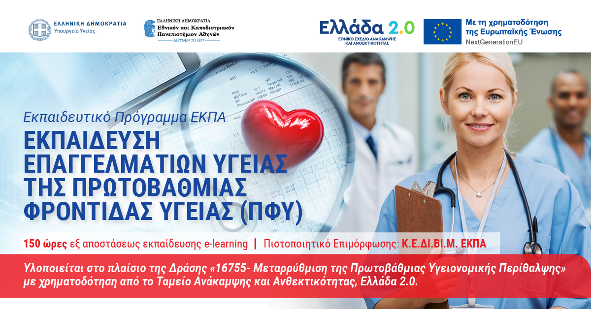«Εκπαιδευτικό Πρόγραμμα ΕΚΠΑ - Εκπαίδευση Επαγγελματιών Υγείας της Πρωτοβάθμιας Φροντίδας Υγείας (ΠΦΥ)». Υλοποιείται στο πλαίσιο της Δράσης «16755- Μεταρρύθμιση της Πρωτοβάθμιας Υγειονομικής Περίθαλψης» με χρηματοδότηση από το Ταμείο Ανάκαμψης και Ανθεκτικότητας, Ελλάδα 2.0.