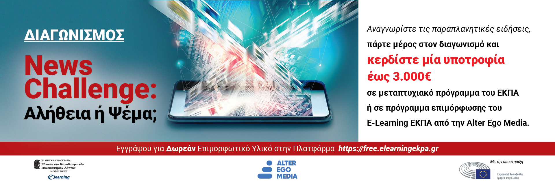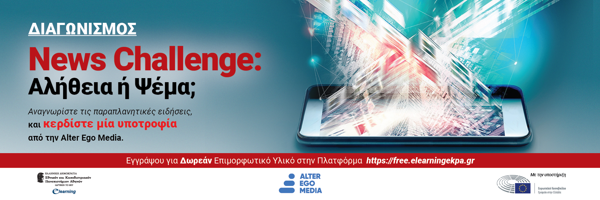 Ο Όμιλος Alter Ego Media, σε συνεργασία με το Εθνικό και Καποδιστριακό Πανεπιστήμιο Αθηνών (ΕΚΠΑ) και με την υποστήριξη του Γραφείου του Ευρωπαϊκού Κοινοβουλίου στην Αθήνα, διοργανώνει τον διαγωνισμό News Challenge: Αλήθεια ή Ψέμα;